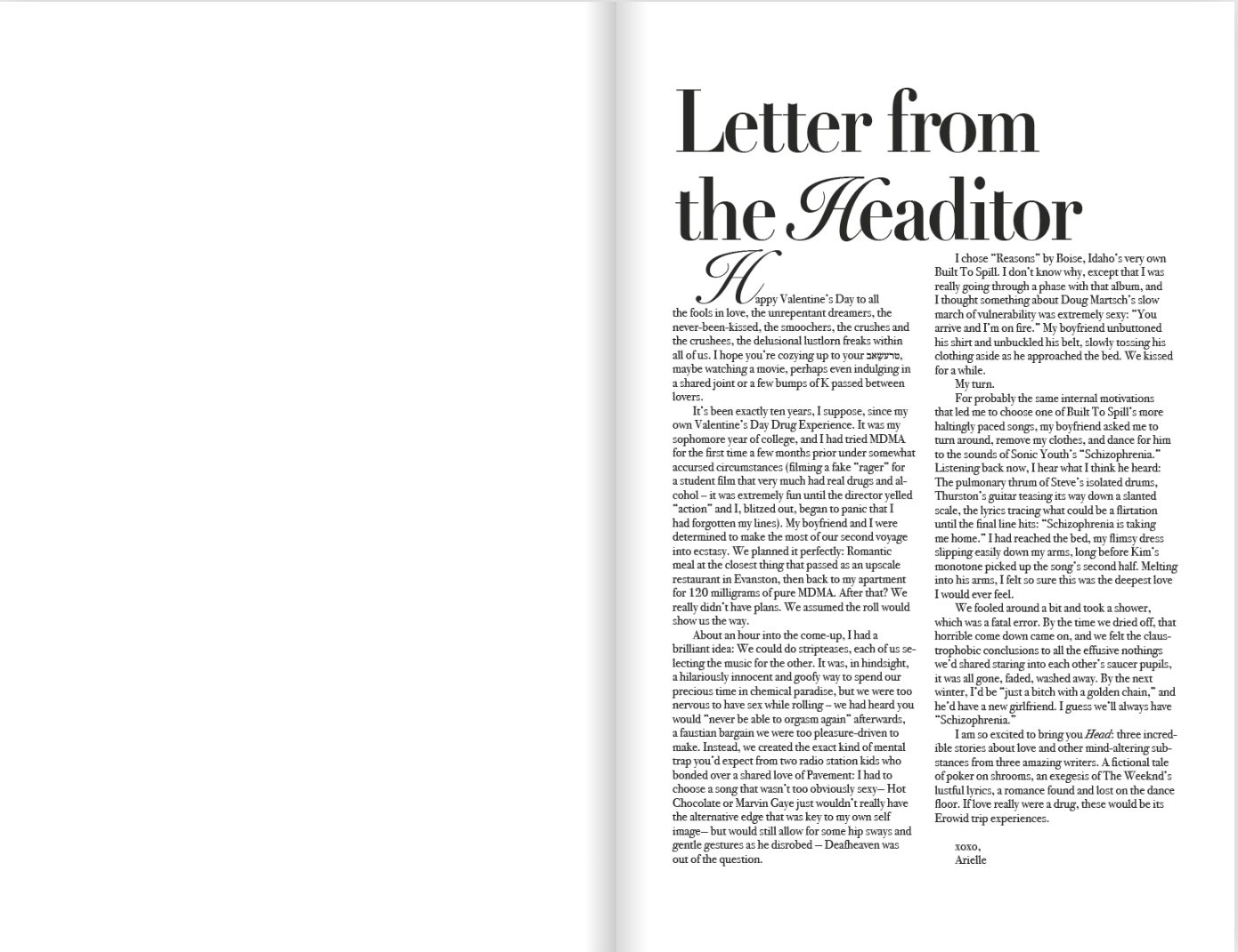 To tide you over before the launch of Drug Music Volume 2: More Drugs, More Music, here's HEAD, a zine about love and other drugs. Featuring original fiction and prose from Jen Vafidis, Dani Blum, and Brittany Dennison.